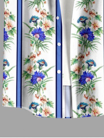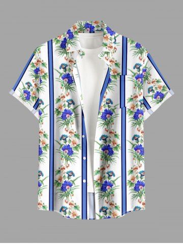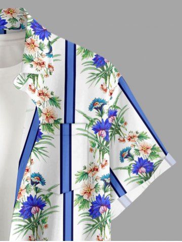 Plus Size Tropical Leaf Flower Striped Print Hawaii Button Pocket Shirt For Men - Bleu Ciel - Bleu Ciel