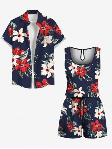Plus Size Tropical Leaf Hibiscus Flower Print Buttons Pocket Hawaii Shirt For Men - Bleu Profond - 2xl