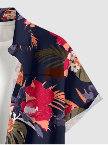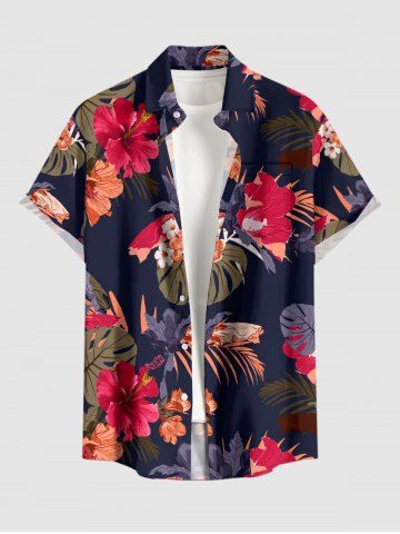 Plus Size Tropical Leaf Hibiscus Flower Print Hawaii Button Pocket Shirt For Men - Bleu Marine - Bleu Marin
