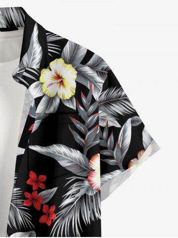 Plus Size Tropical Leaf Hibiscus Flower Print Hawaii Button Pocket Shirt For Men - Noir - Noir