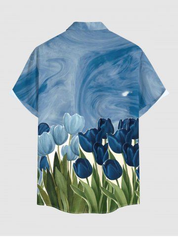 Plus Size Tulip Flower Painting Print Hawaii Button Pocket Shirt For Men - Bleu Ciel - Bleu Ciel