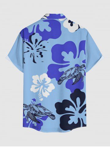 Plus Size Turtle Hibiscus Flower Print Hawaii Button Pocket Shirt For Men - Bleu Clair - Bleu Clair