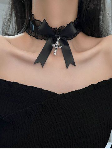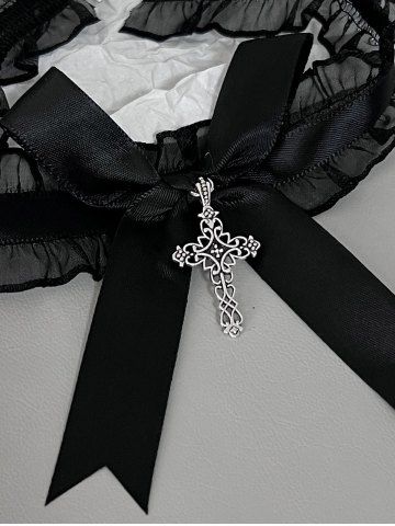 Collier en Dentelle avec Nœud et Croix Style Gothique - Noir - Noir