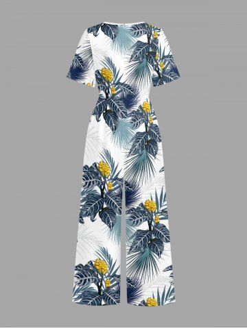 Combinaison hawaïenne à imprimé floral tropical et feuilles, col en V et jambes larges - Bleu Profond - S