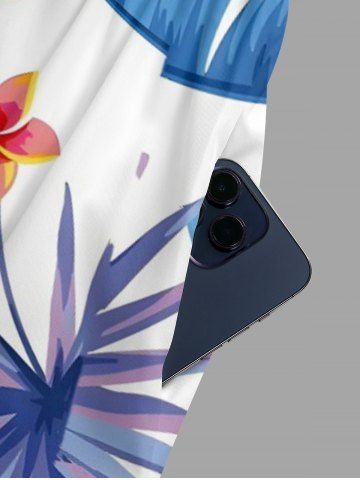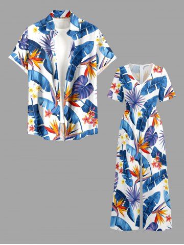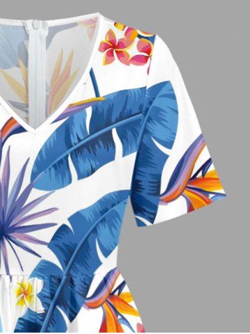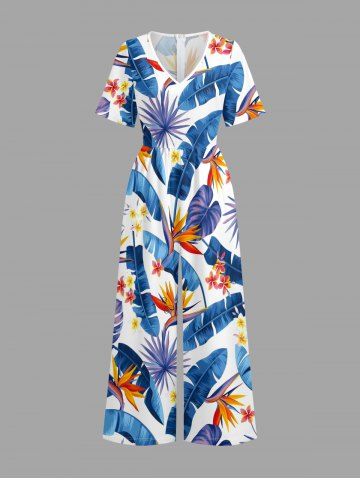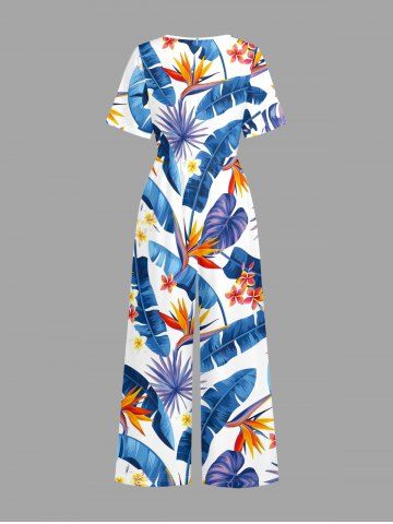 Flowers Tropical Leaf Print V Neck Hawaii Wide Leg Jumpsuit - Bleu - Bleu