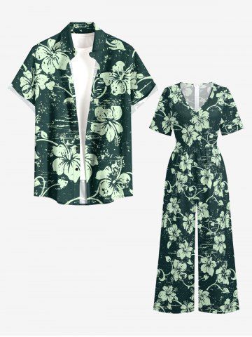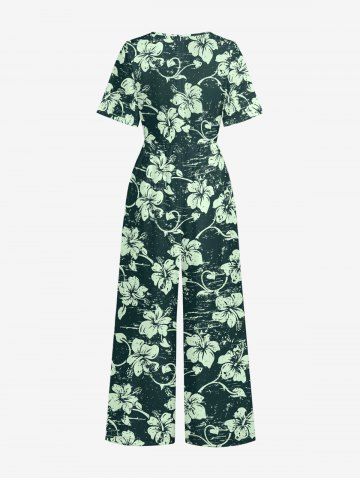Hibiscus Flowers Leaf Print V Neck Hawaii Wide Leg Jumpsuit - Vert Profond - M