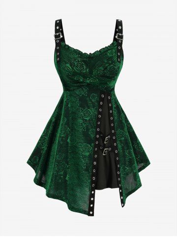 Plus Size Rose Flower Printed Crossover Bust Buckle Grommet Split Ribbed Layered Tank Top