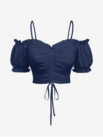 Plus Size Cold Shoulder Puff Sleeve Cinched Solid Top - Bleu Profond - L