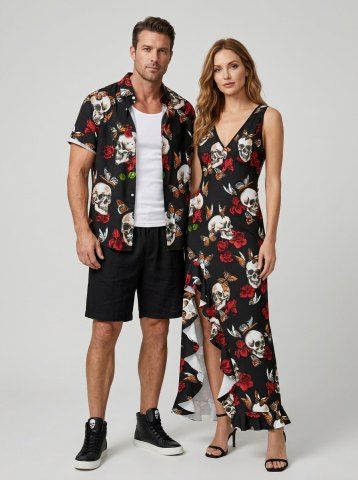 Ensemble Assorti Couple> Ensemble assorti pour couples avec imprimé têtes de mort, papillons et fleurs