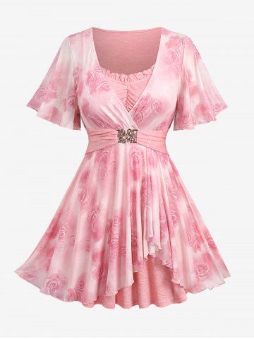 a*****a5Plus Size Rose Flower Print Ruched Ruffles Tulip Hem Buckle Surplice 2 In 1 TopColor: LIGHT PINK Size: M | US 10LOVE this top! It's a lot like the blue one I ordered in the same order but the roses make such a cute design and the fit is so flattering with the belt attached. Very cute and comfortable, and can be very work- formal with the right jewelry
