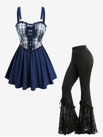 Plaid Print Flower Embroidery Lace Up Top and Skull Stars Flocking Pocket Flare Pants Outfit - Bleu - Bleu