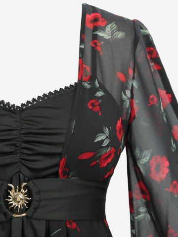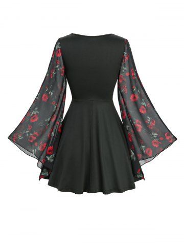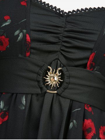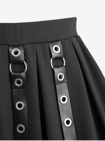 Ensemble 2 en 1 : haut à imprimé rose froncé et ceinture, et jupe trapèze à œillets et bretelles en PU. - Noir - Noir