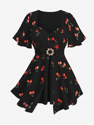 Ensembles Assortis > Ensemble grande taille : chemisier croisé à carreaux gaufrés cerises et pantalon évasé à imprimé floral.