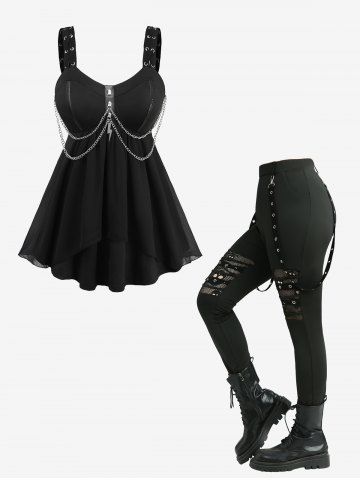 Ensembles Assortis> Ensemble grande taille composé d'un débardeur en maille superposée à lacets et d'un legging patchwork en résille ajourée à motif de crâne