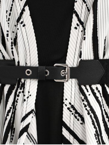 R*****a5Plus Size White Black Stripes Zebra Print Ruched Belt Handkerchief T-shirtColor: BLACK Size: M | US 10Nice double layers shirt. Looks and fits exactly as you see in the photo. The belt is separate that you just lay on top. The way it's made, you can't cut out the inside material if you are thinking using it as a jacket with other shirts. I was going to do that, but I'll just keep it as is. Outside is a medium polyester ribbed material,, the inside part is made of a smooth soft material.