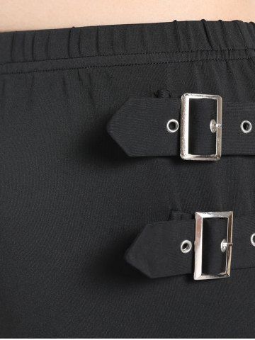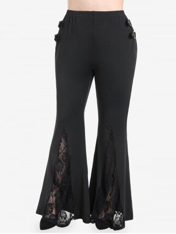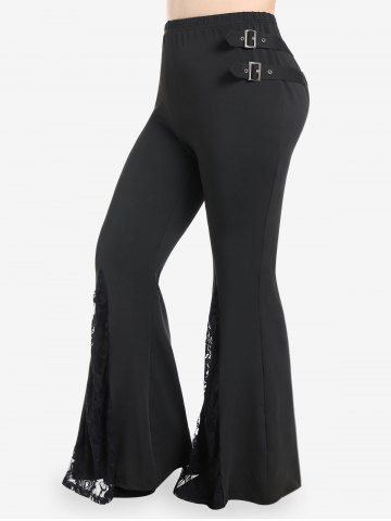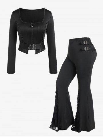 Ensemble avec Haut Court Zip en Avant et Pantalon Bouclé Evasé Panneau en Dentelle de Grande Taille - Noir - Noir