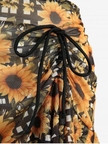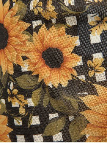 Femme> Maillot de bain tankini 3 pièces à imprimé écossais tournesols, dos nu croisé avec nœud papillon et volants.