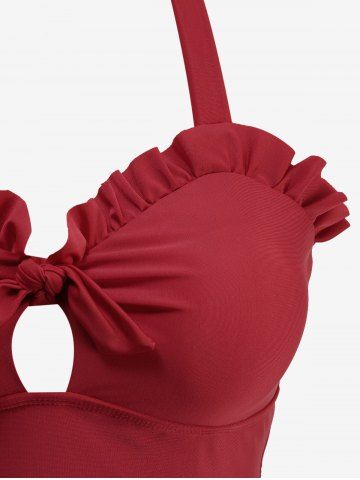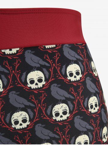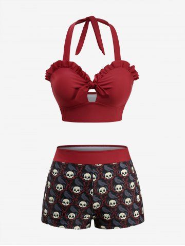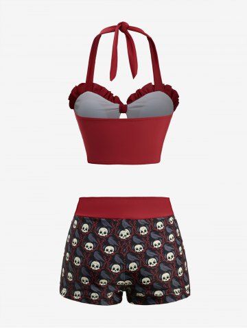 Maillot de bain tankini dos nu à imprimé tête de mort et corbeau, à volants et nœud papillon. - Rouge - Rouge