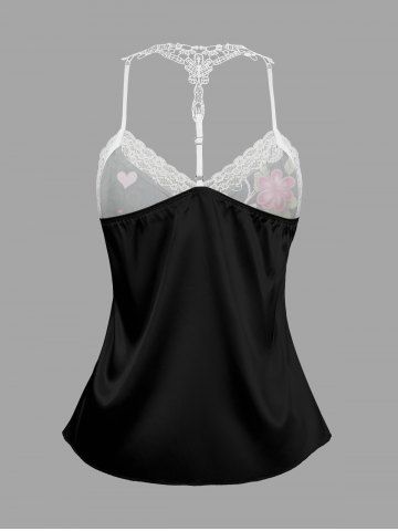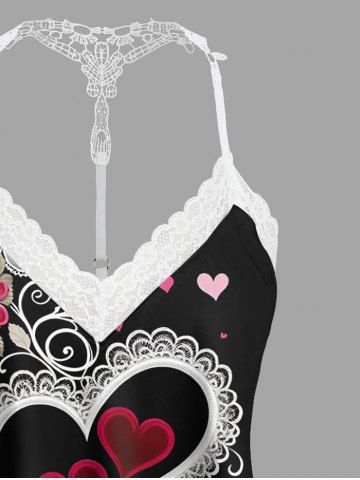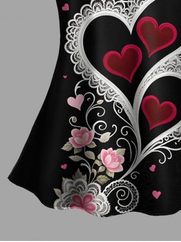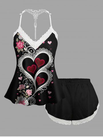 Haut de pyjama crocheté grande taille à imprimé fleurs, feuilles et cœurs, bordure en dentelle, idéal pour la Saint-Valentin - Noir - Noir