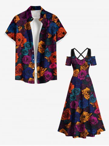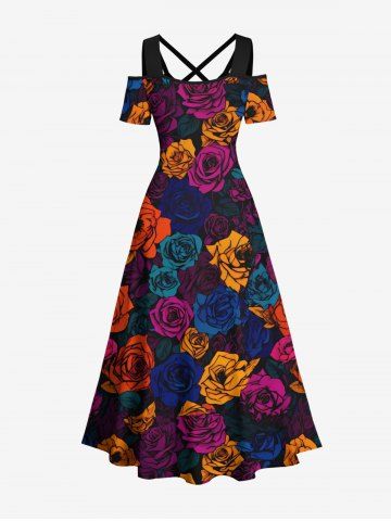 Grandes Tailles > Plus Size Valentine's Day Colorful Rose Flowers Print Cold Shoulder Crisscross Maxi Dress