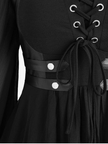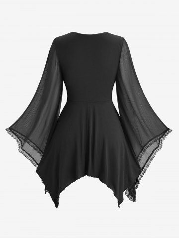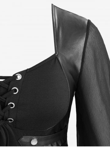 Haut gothique grande taille à lacets en cuir PU avec bordure en dentelle et manches évasées asymétriques - Noir - Noir
