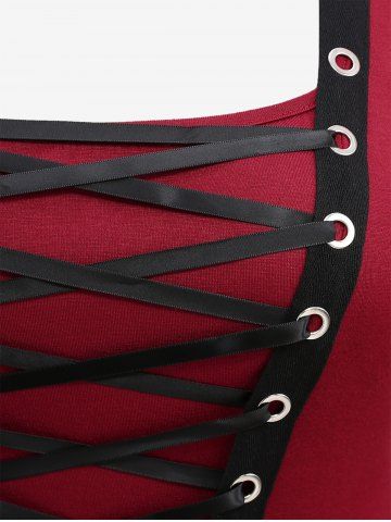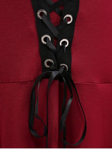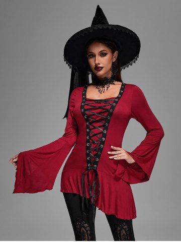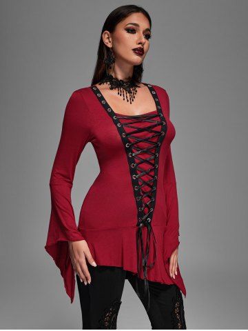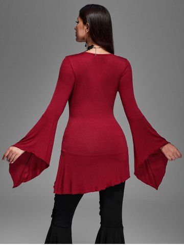 T-shirt Asymétrique Gothique Manches Evasées à Volants à Lacets - Rouge - Rouge