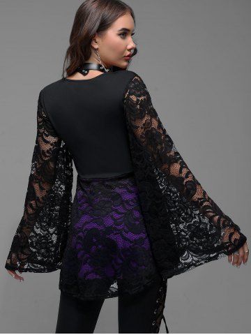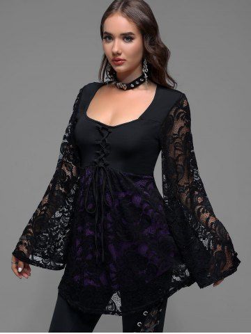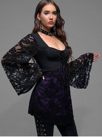 Witch Halloween Costume Lace Flare Sleeves Lace-up Two Tone T-shirt