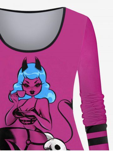 T-shirt D'Halloween Crâne Imprimée Rayé de Grande Taille à Manches Rayées - Rose Clair - Rose Léger