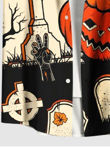 Chemise à boutons et poches pour homme, costume d'Halloween grande taille, imprimé citrouille, croix, hibou, arbre, pierre tombale - Orange - Orange