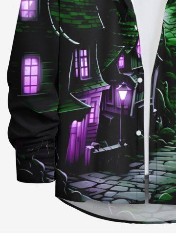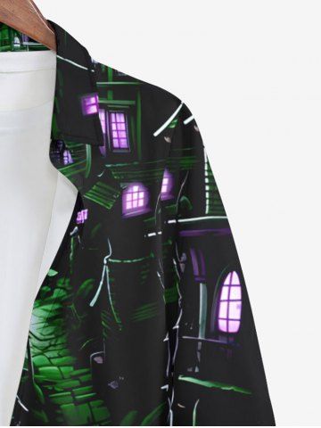 Chemise D'Halloween Château et Lanterne Imprimés Boutonnée de Grande Taille à Paillettes pour Homme - Noir - Noir