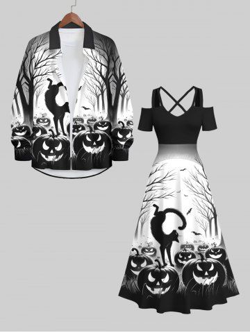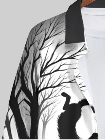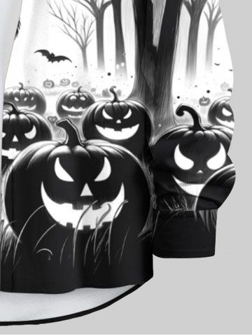 Chemise D'Halloween Citrouille Chat et Chauve-souris Imprimés de Grande Taille avec Boutons à Manches Longues - Noir - Noir
