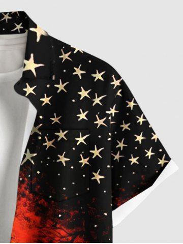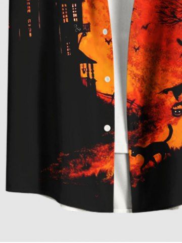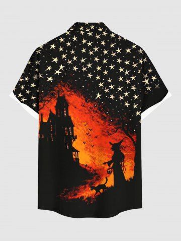 Homme> Chemise grande taille à boutons et poches pour homme, motif chat, sorcier, chauve-souris, étoiles d'Halloween