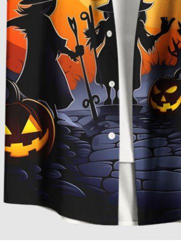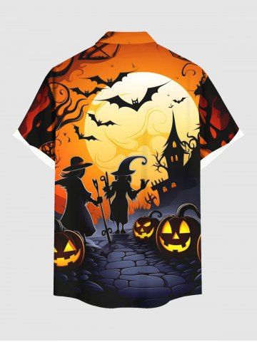 Homme> Chemise grande taille à boutons et poches pour homme, motif citrouille, chauve-souris et lune d'Halloween
