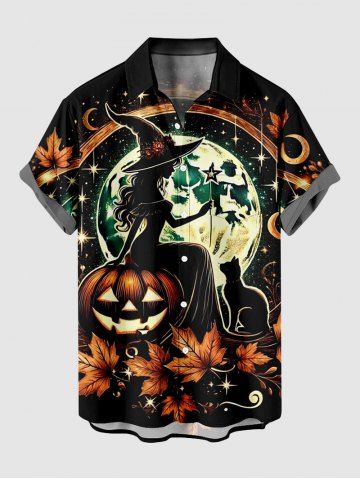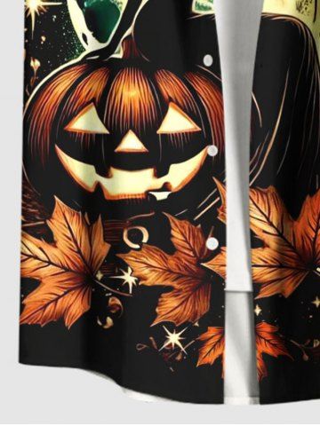 Homme> Chemise grande taille à boutons et poches pour homme, motif citrouille d'Halloween, chat, sorcière, feuille d'érable, lune