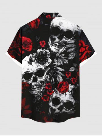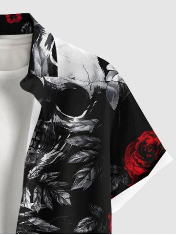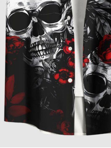 Chemise grande taille à boutons et poches pour homme, motif tête de mort, roses et fleurs, pour Halloween - Noir - Noir