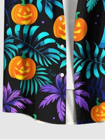 Homme> Chemise grande taille à imprimé cocotier, feuilles tropicales et citrouilles pour homme, avec poches boutonnées pour Halloween