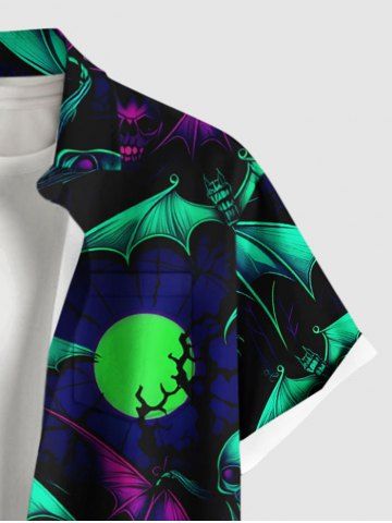 Chemise grande taille à imprimé tête de mort, chauve-souris et lune pour homme, avec poches boutonnées pour Halloween - Noir - Noir