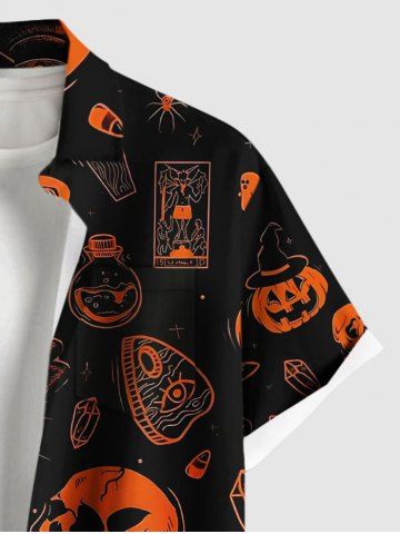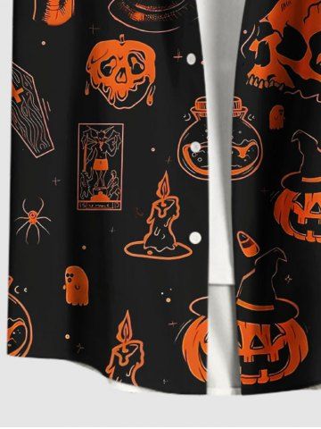 Homme> Chemise grande taille à imprimé tête de mort, citrouille et pierre tombale pour homme, avec poches boutonnées pour Halloween