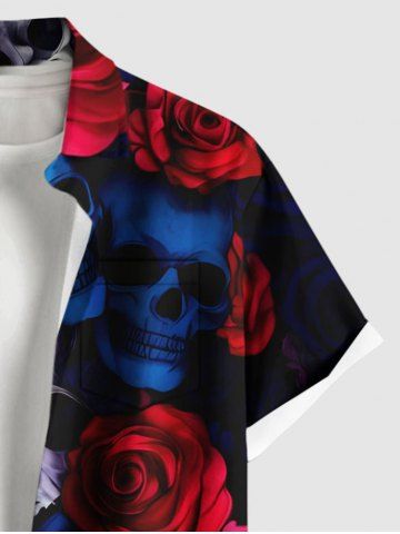Chemise grande taille à imprimé tête de mort et roses pour homme, avec poches boutonnées et imprimé Halloween - Noir - Noir