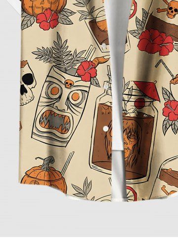 Chemise grande taille à imprimé tête de mort, fleur, citrouille, masque, Halloween, boutonnée, poche, pour homme - Café Lumière - 2xl