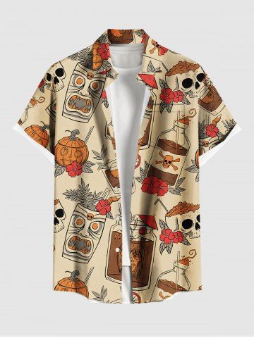 Chemise grande taille à imprimé tête de mort, fleur, citrouille, masque, Halloween, boutonnée, poche, pour homme - Café Lumière - 5xl