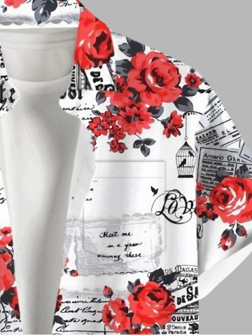 Homme> Chemise grande taille pour homme, imprimée de fleurs et de lettres de journal, avec poche boutonnée, idéale pour la Saint-Valentin.