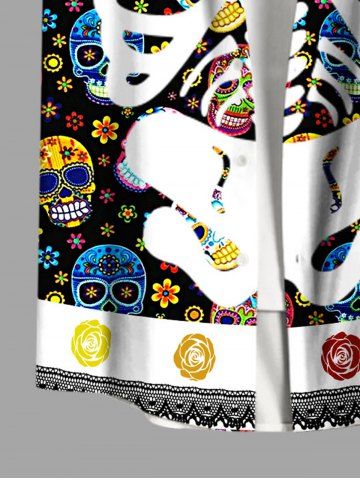 Chemise grande taille pour homme, motif squelette d'Halloween, crânes colorés, fleurs, boutons et poches - Noir - Noir