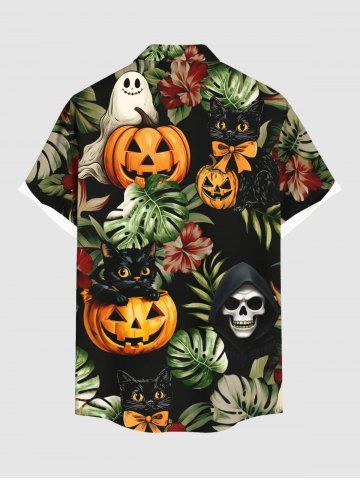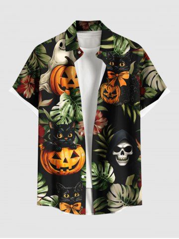 Homme> Chemise hawaïenne grande taille pour homme, motif citrouille, crâne, chat, feuilles tropicales, fleurs, boutons, poches