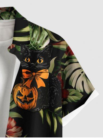 Chemise hawaïenne grande taille pour homme, motif citrouille, crâne, chat, feuilles tropicales, fleurs, boutons, poches - Noir - Noir
