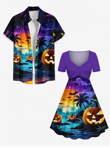 Halloween Pumpkin Lantern Coconut Tree River Bat Moon Ombre Galaxy Print Plus Size Matching Outfit For Couples