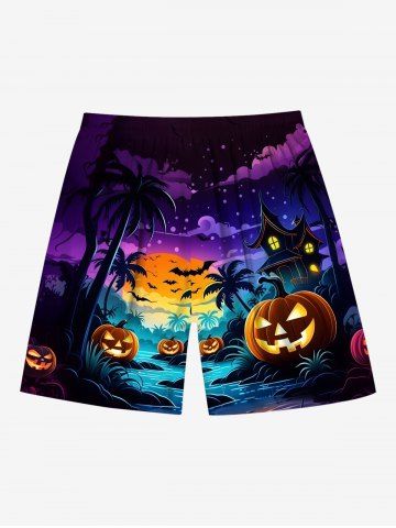 Homme> Short de plage grande taille pour homme, imprimé citrouille, chauve-souris, cocotier, lune, château, cordon de serrage, poche