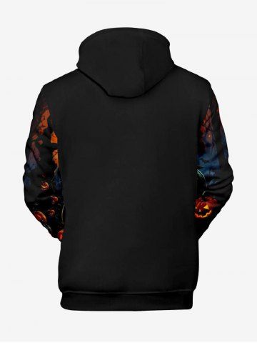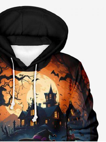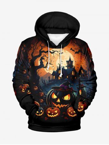 Sweat à Capuche D'Halloween Lanterne de Citrouille et Château Imprimés Grande Taille avec Poche à Paillettes pour Homme - Noir - Noir