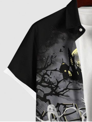 T-shirt Imprimé Castille dans la Lune et Citrouille D'Halloween Grande Taille avec Boutons - Noir - Noir