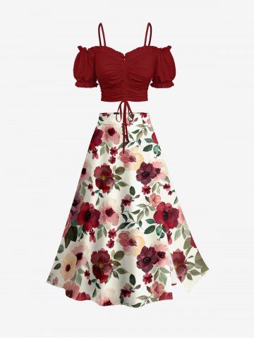 Jupe hawaïenne fendue à imprimé fleurs et feuilles grande taille - Rouge Foncé - 2x